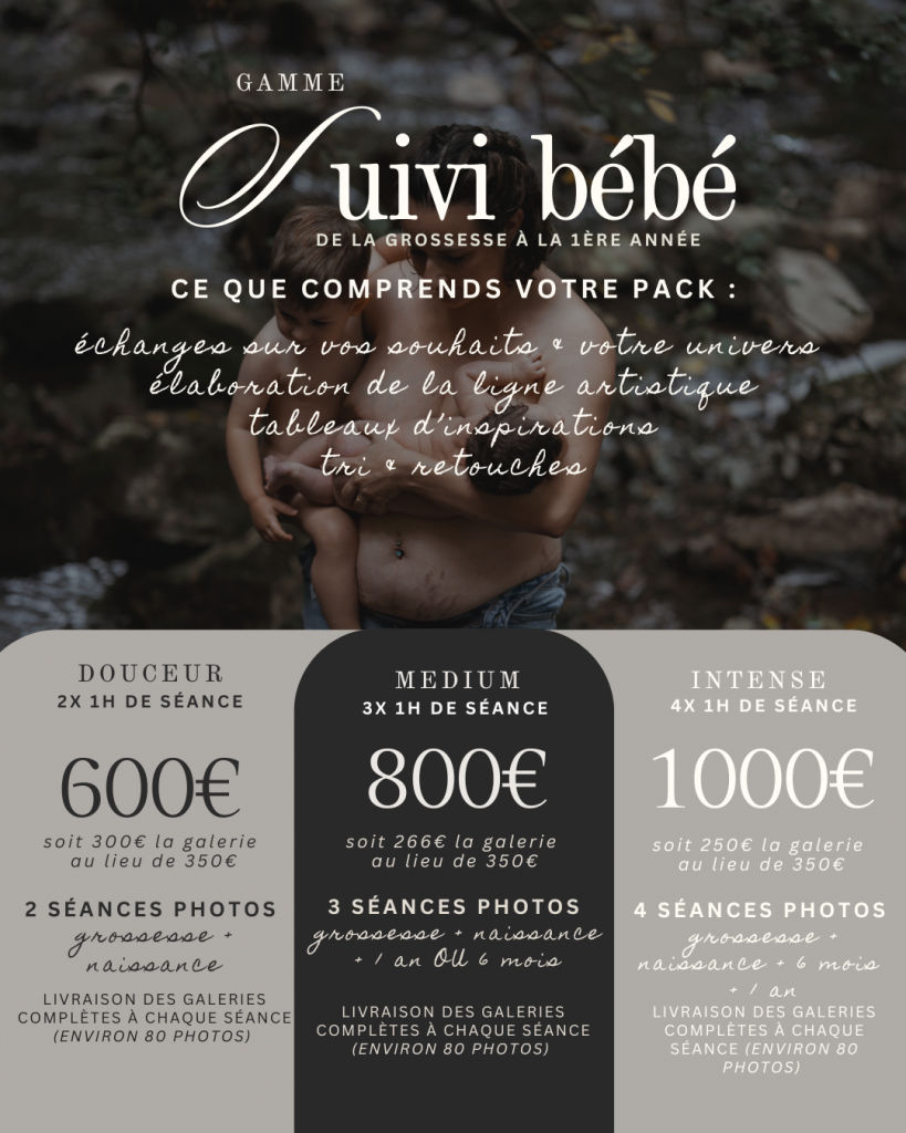 SUIVI BÉBÉ : un pack modulable à votre guise pour immortaliser les moments essentiels ✨ des photos de grossesse aux alentours de 6/7eme mois – le 1er mois de bébé – puis les 6 et 12 mois de vie.